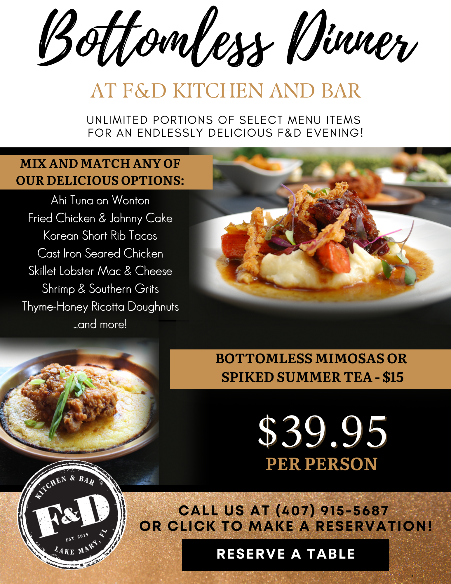 This email graphic advertising F&D’s Bottomless Dinner specials was created to give the restaurant a clean, classy way to show off their special dinner deal via email.