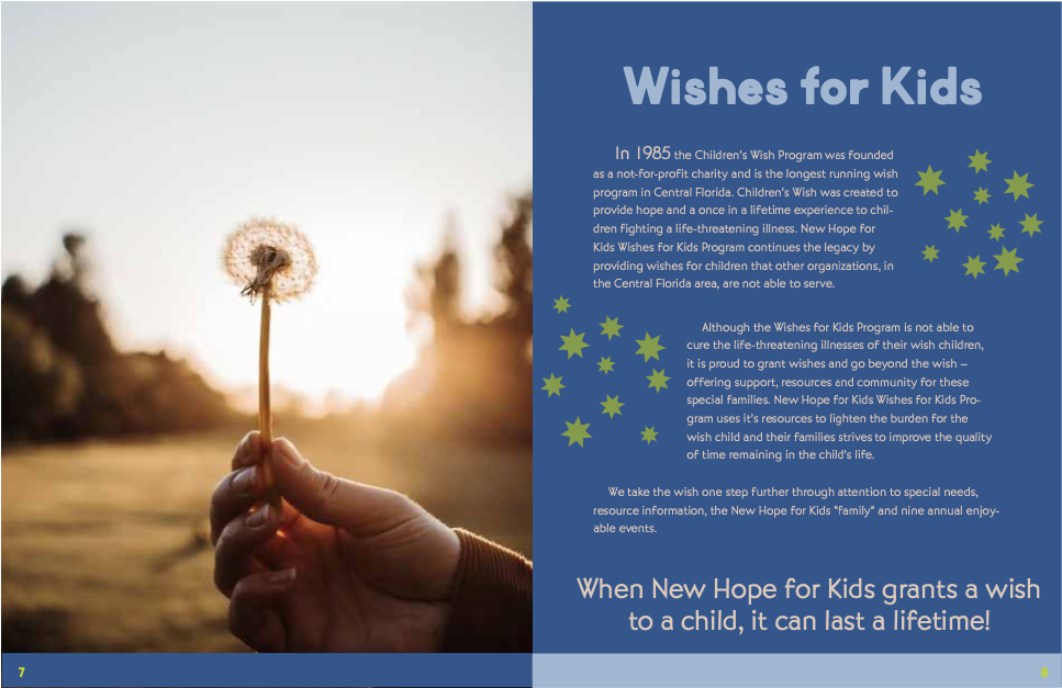 ThisĀ annual report book was created for New Hope For Kids, a non-profit organization that helps children deal with grief.